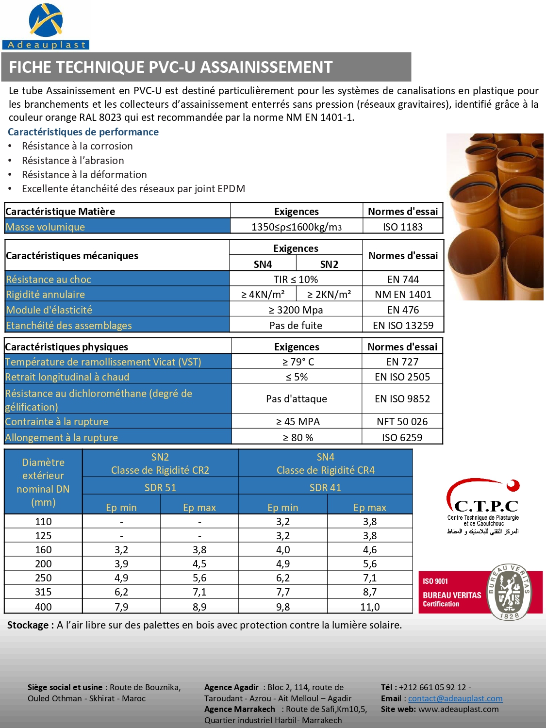 | Diamètre extérieur (mm) | SN2 Classe de Rigidité CR2 SDR 51 | SN4 Classe de Rigidité CR4 SDR 41 | ||